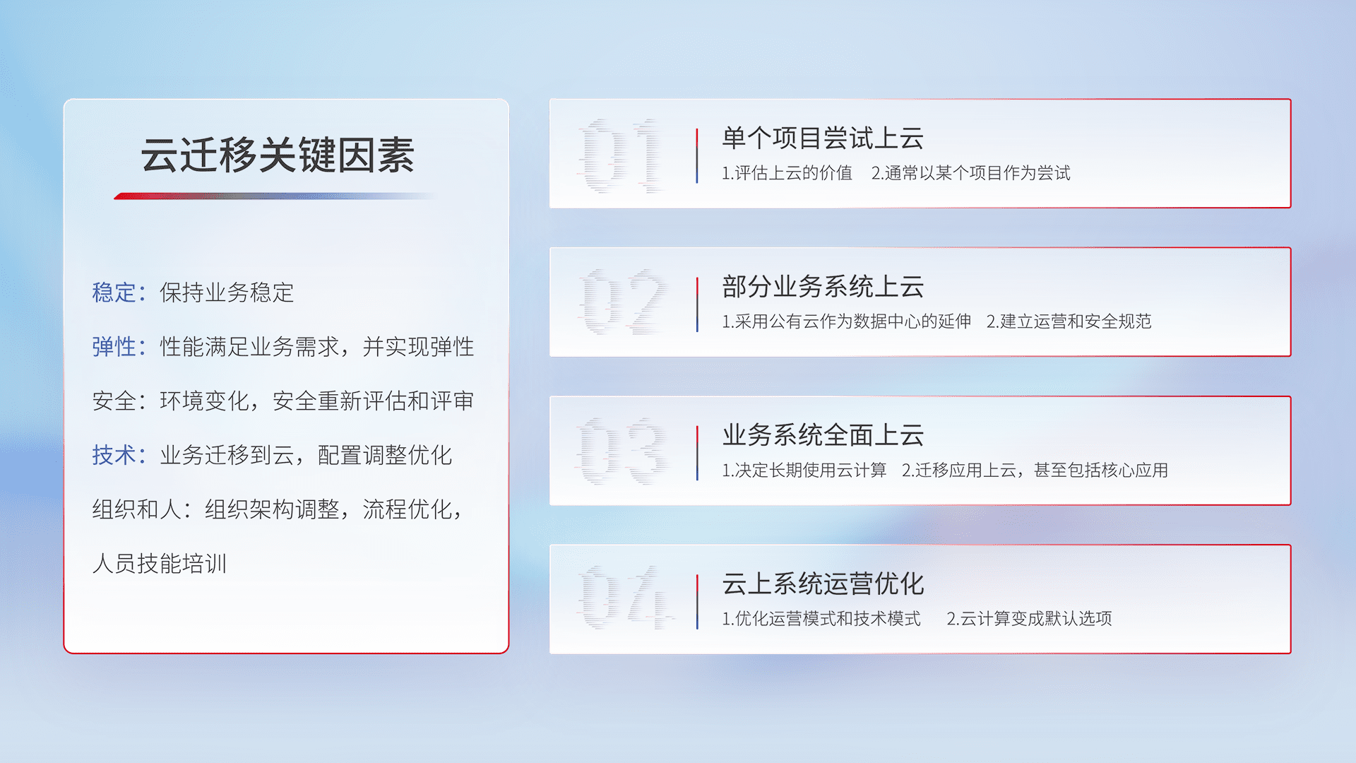 结合实际业务,,,,从规划设计、、云平台选型、、、、云原生改造、、、、数据迁移、、集成交付,,迁移全过程为客户识别最佳上云路径,,,做好风险识别管理,,,设计网络架构、、身份权限、、、安全审计合规、、操作审计、、日志审计、、监控告警策略、、、多站点容灾设计等,,,对云上基础设施进行整体规划,,,提升IT治理水平,,以满足弹性、、、、高可用、、高性能的需求。。。